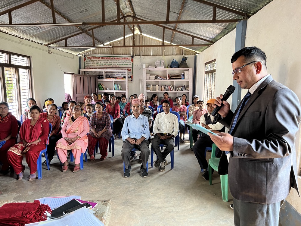 Gegen 13:45 Uhr waren alle Ziegen im Hof angepflockt und für die Verlosung nummeriert. Die Kinder hatten ihren Spaß, die Ziegen in Zaum zu halten. Damit konnte dann jedenfalls die Zeremonie starten. Der Dorfrat war zusammen mit uns auf der Bühne versammelt. Erstmal wurden wir alle mit Tikka begrüßt, dann gab es Tikka und Blumen für Gott und dann gingen die Reden los. Im Publikum saßen die zukünftigen Ziegenhalter*innen, Schulpatenschaftskinder, Gewächshausnutzer*innen und wer sonst noch in die Halle passte. Auch wir mussten jeweils eine kleine Rede halten, der Bürgermeister sprach, Gita und Dipendra, eine Dorfrätin…